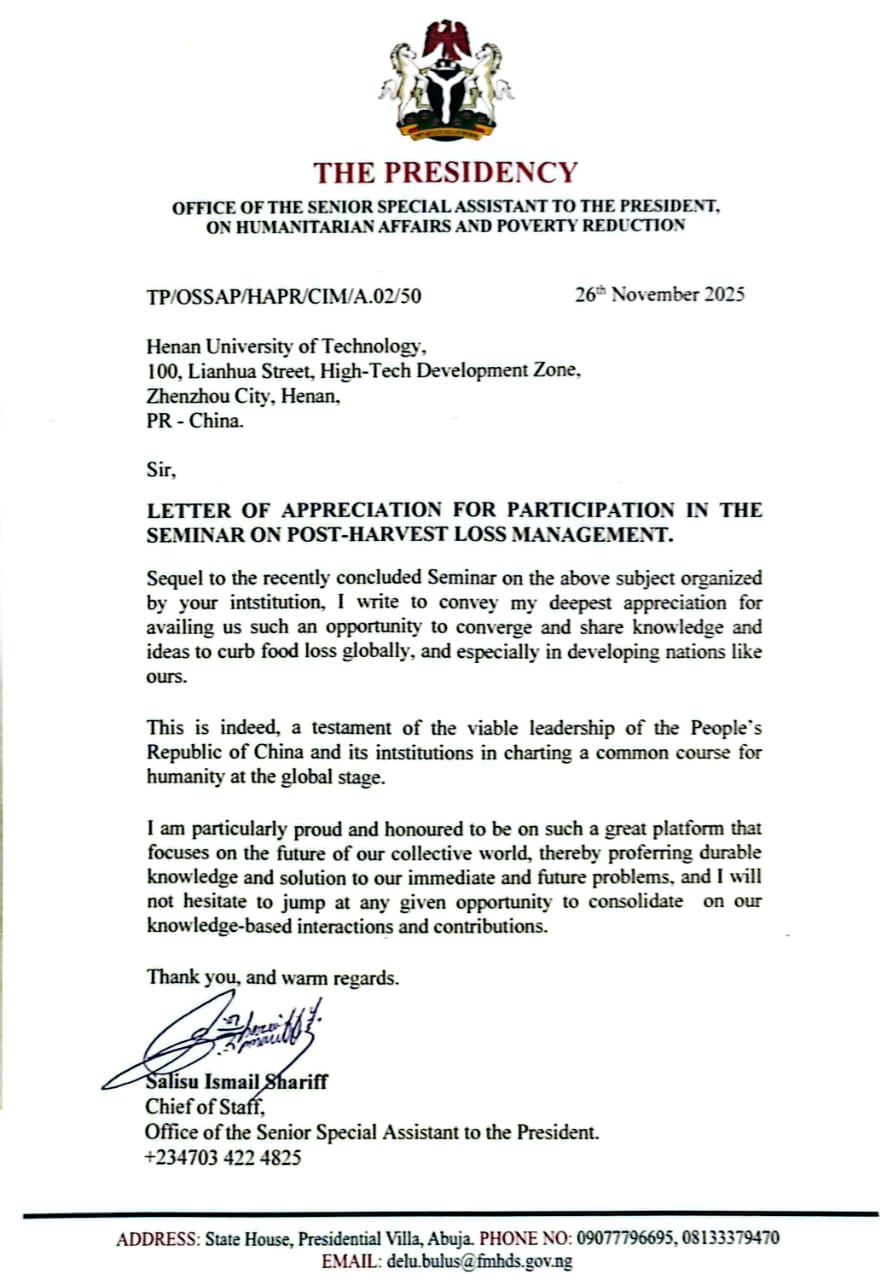 近日,尼日利亚总统府向我校发来感谢信。对我校在10月10日至30日期间承办的“非盟国家粮食产后安全研修班”进行高度赞扬并表示感谢,该感谢信由尼日利亚总统首席幕僚萨利苏·伊斯梅尔·沙里夫亲笔签署。尼日利亚总统府在来信中称由我校组织承办的“非盟国家粮食产后安全研修班”是为全球粮食安全事业搭建的重要平台,彰显了中国在国际合作中的卓越领导力。