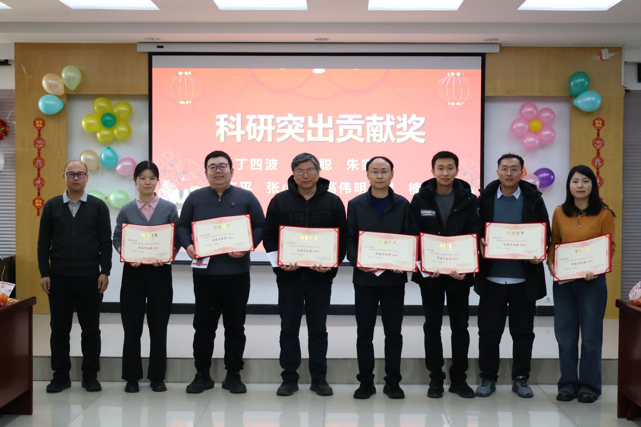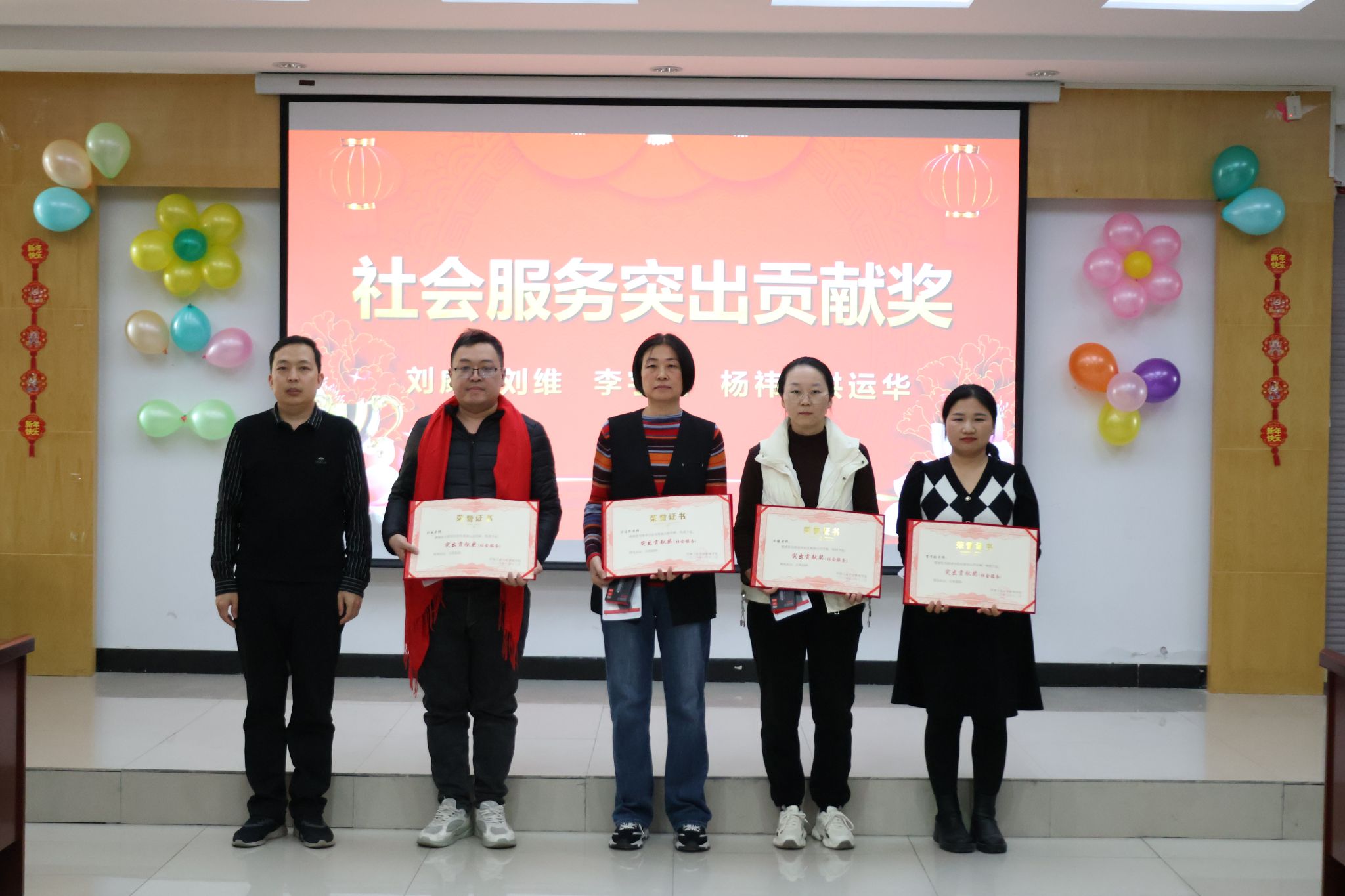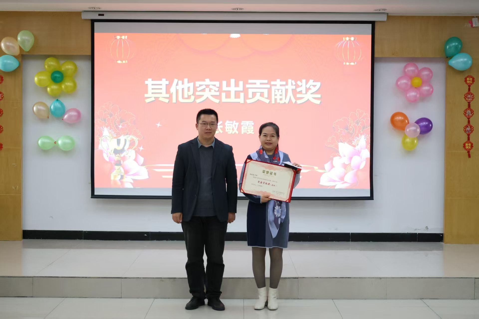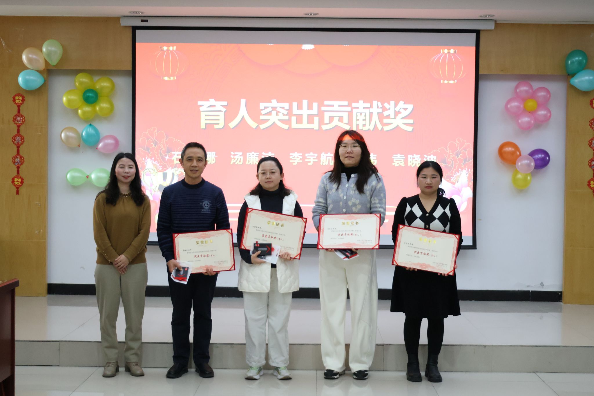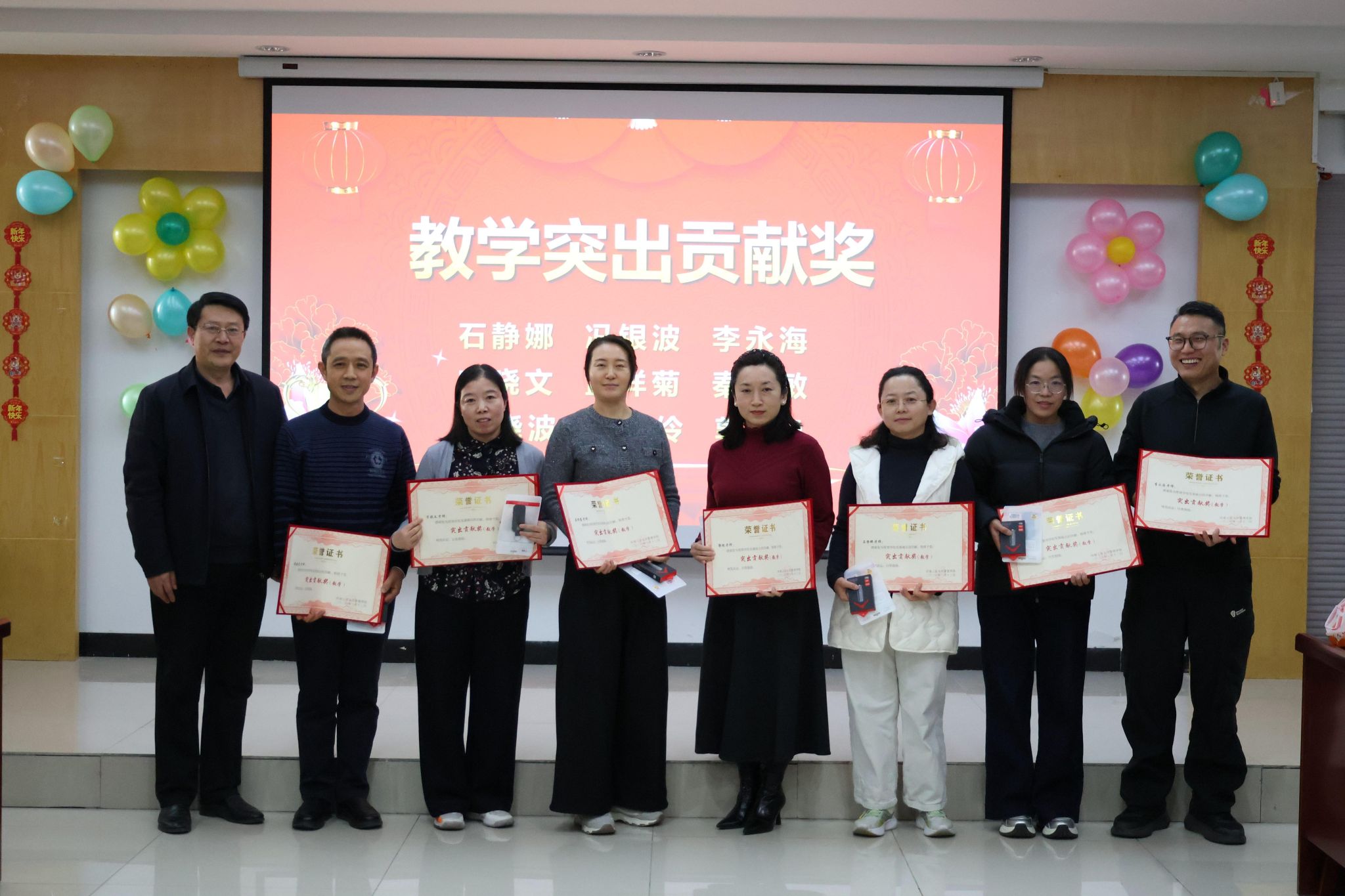 颁奖环节有序展开,“社会服务突出贡献奖”“教学突出贡献奖”“科研突出贡献奖”“育人突出贡献奖”“其他突出贡献奖”五大奖项依次揭晓,共有27名教师荣膺表彰。学院领导班子成员作为颁奖嘉宾,为获奖教师逐一颁发荣誉证书与奖品,并与他们合影留念,共同记录这一光荣时刻。