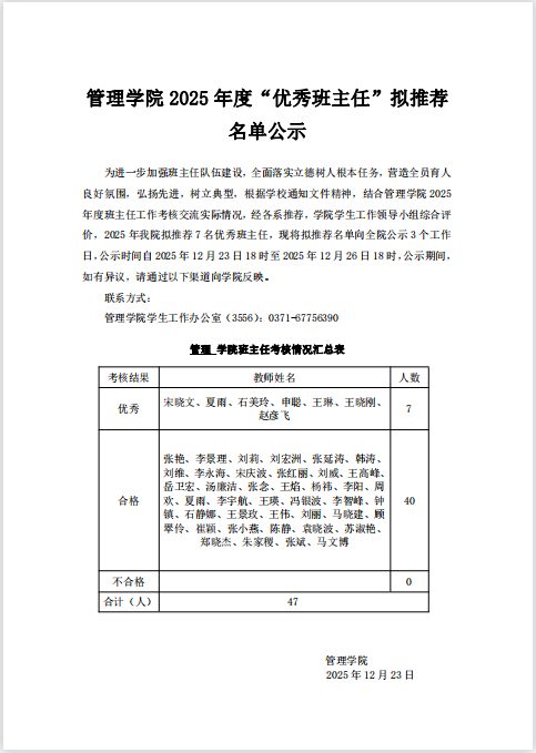 澳门博彩官网 2025年度“优秀班主任”拟推荐名单公示