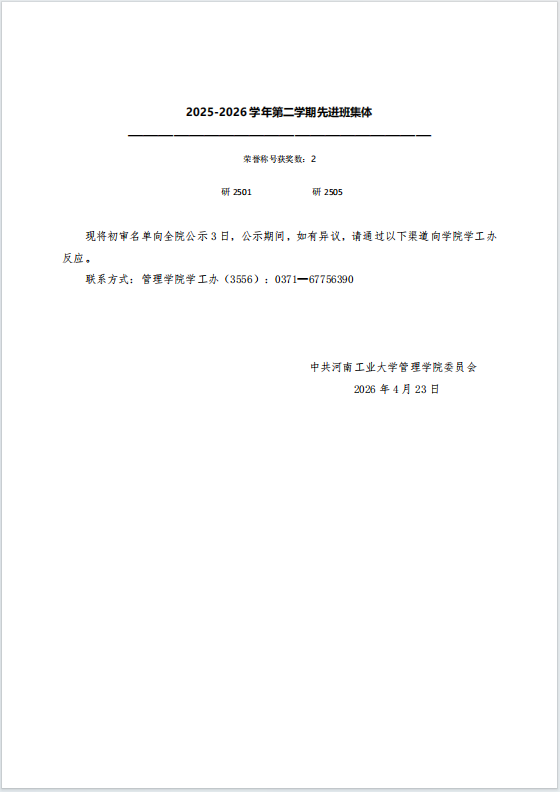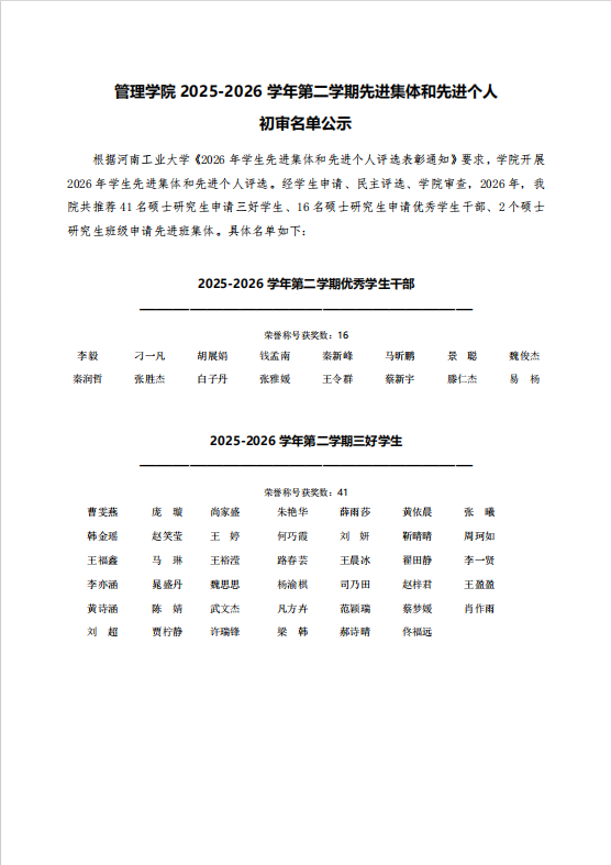 澳门博彩官网 2025-2026学年第二学期先进集体和先进个人 初审名单公示