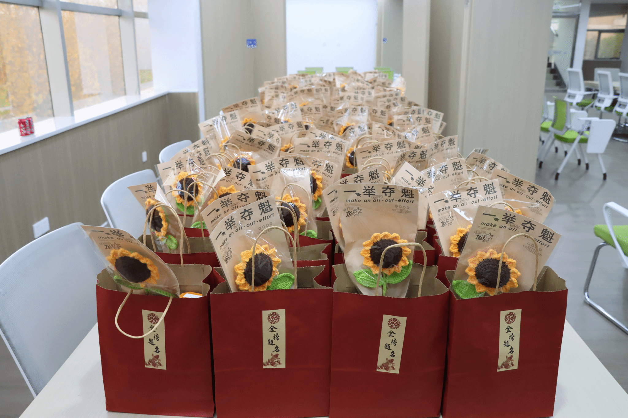 随后,曹启娥详细阐释了学院精心准备的慰问礼物背后的深意,让这份关怀更添温度。她介绍道:“一个个饱满的苹果,承载着学院对大家‘平安应考、顺遂通关’的美好祝愿;一朵朵手工编织的向日葵,象征着‘向阳而生、一举夺魁’的奋进力量;还有‘得偿所愿’的薯愿与‘金榜题名’的定制可乐,每一份都装着学院的殷切期许。” 同时,她也为学子送上贴心叮嘱:“考研不仅是知识的比拼,更是心态的较量。当前已进入冲刺关键期,大家要学会放松身心,别让过度焦虑影响发挥,以从容姿态奔赴考场,相信每一份付出都终将收获回报。”