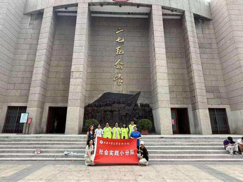 活动尾声,实践团队在二七纪念堂前展旗合影。夕阳辉映着这片革命圣地,鲜红的队旗迎风飘扬。快门按下的那一刻,青春的身影与承载厚重历史的纪念建筑融为一体。